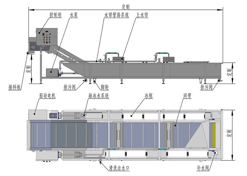 5)水产品包冰衣机采用两套独立的水系统,一套用来水与冰的融合、循环,另一套用来实现上水帘。从而实现低温水循环以及水帘包冰的目的;